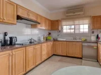 На первом этаже есть сплошная деревянная полностью оборудованная кухня с гранитными столешницами. Кухня большая с достаточным хранилищем