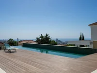 Первый этаж предлагает просторную гостиную и столовую планировку с местом пожара и доступом к обширной террасе с переполненным бассейном (с отоплением) и прямым видом на море, гладким шеф-поваром, гостевой WC.