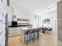 На второй этаж можно подняться на лифте, где расположены еще две спальни: главная с просторной верандой с видом на море и гостевая с видом на сад. Цокольный этаж, представляющий собой многофункциональное пространство, может быть использован для создания дополнительных жилых или игровых зон, например, детской комнаты или кинозала. Здесь также есть студия для персонала с удобным доступом к основному уровню. Этот дом, оснащенный по последнему слову техники, включая полы с подогревом и кондиционеры VRV, предлагает комфорт и стиль для поистине роскошной жизни.
