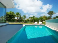Дом расположен в небольшом бутик-комплексе вилл на первой линии с панорамными видами на море. На нижнем уровне находятся 3 спальни с ванными комнатами, служебное помещение/прачечная и техническое помещение. На первом этаже расположены кухня, столовая и гостиная открытой планировки с панорамными раздвижными дверями, ведущими к бассейну и саду.