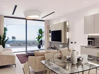 The open-plan living room seamlessly integrates with the kitchen, creating a spacious and cohesive environment. Decorated in neutral colors, the space exudes a calm and inviting ambiance. Expansive windows flood the room with natural light, enhancing the airy feel and offering beautiful views that complement the sophisticated design.