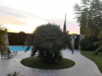 Inside, there's a spacious living room connected to a dining area and a stylish kitchen. Downstairs, there's a bedroom with its bathroom, a guest toilet, and a small kitchen. The dining area leads to a stunning garden with a BBQ area, a large 12x4m pool, and plenty of space for outdoor dining.