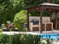 There is a fantastic BBQ area accompanied with a large infinity edge swimming and a spacious patch of green grass surrounding the pool.