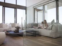 The main level boasts a seamless kitchen and living area that opens to a pool and BBQ space, while a glass gallery bridge leads to the private master suite. The lower level features guest bedrooms with sunny terraces.