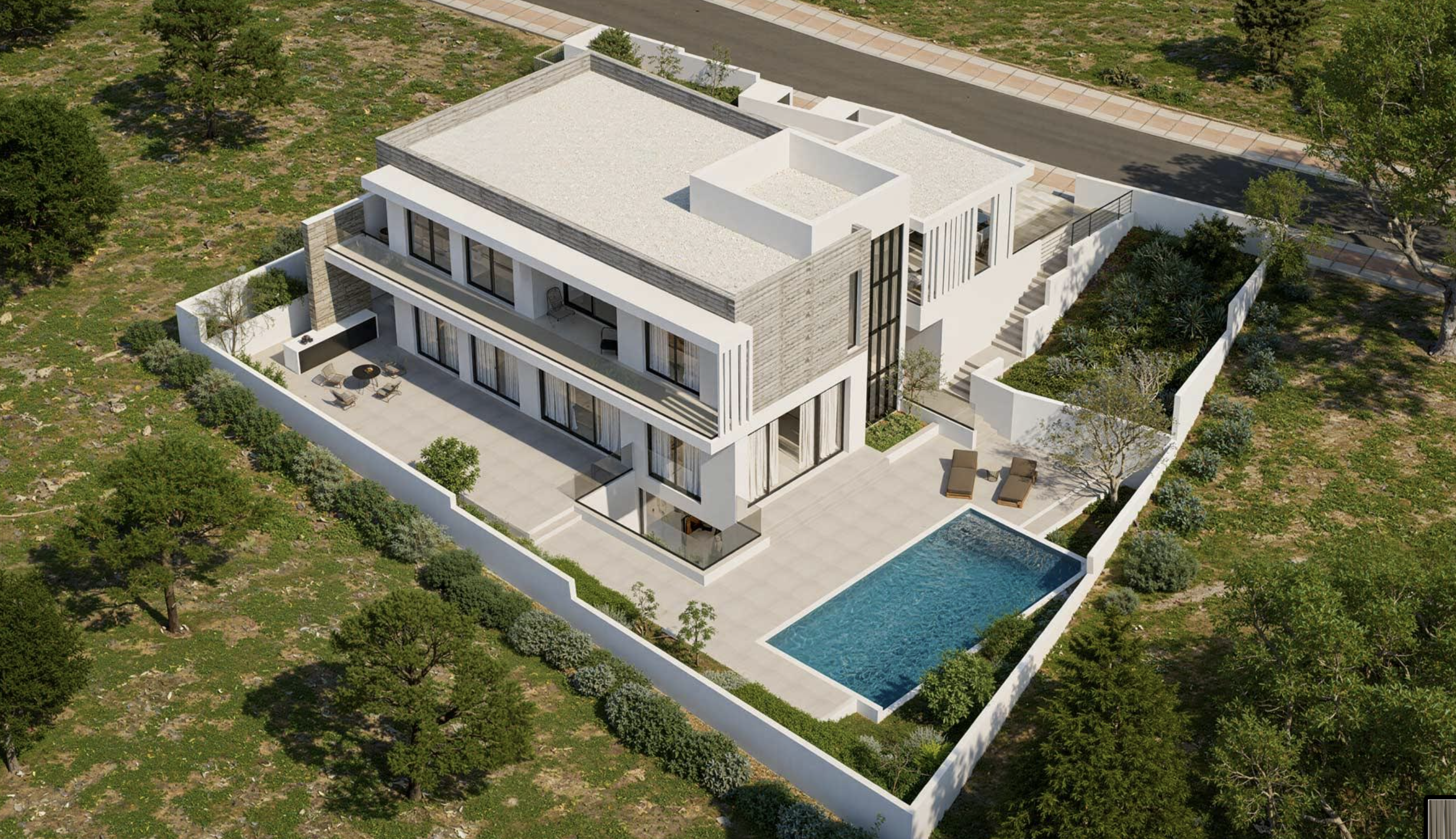 Разработанная с современным архитектурным подходом, вилла сочетает в себе элегантность и функциональность, с высококлассными материалами, просторными жилыми помещениями открытой планировки и большими окнами, которые максимизируют естественный свет и виды.