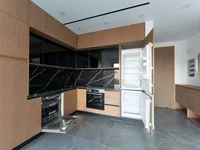 Интерьер выполнен с акцентом на практичность и современную эстетику: светлая гостиная зона открытой планировки дополнена современной кухней, оснащённой полным комплектом техники Bosch, включая холодильник, духовой шкаф, варочную поверхность, вытяжку, посудомоечную и стиральную машины, что обеспечивает комфорт в повседневной жизни.