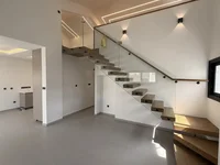 Недвижимость расположена на трех уровнях: подвал, первый этаж и первый этаж. Подвал имеет отдельный вход и устроен как однокомнатная квартира с открытой кухней и гостиной, одной спальней и ванной комнатой. Он также обеспечивает прямой доступ к открытой местности с зоной барбекю.
