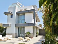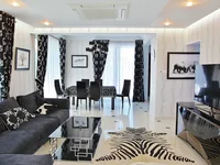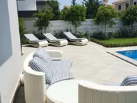 На первом этаже - просторная гостиная-столовая, пол которой выложен белым керамогранитом, кухня со встроенной итальянской мебелью и гостевой санузел с установленной сантехникой. Гостиная имеет раздвижные окна с выходом на бассейн.
