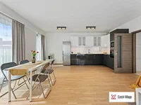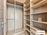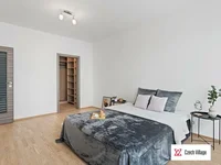 3+KK apartment with an area of 102 m2 in Prague in Žižkov — Residence Garden Towers. The apartment is located on the 6th floor of building 4D. The entrance to the apartment begins with a long corridor with a built-in mirror cabinet. Entrances to individual rooms lead from the corridor. The apartment has two small bathrooms equipped with a toilet, a bath, a shower corner and a corner for a washing machine and a dryer. In the bedroom you will find a dressing room with built-in open wardrobes.
