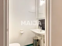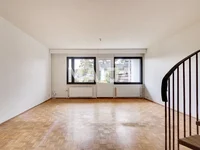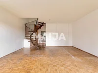 The downstairs of the home is spacious and bright. Wall and ceiling surfaces have been repainted this year. From the living room there is access to a nice sized courtyard facing south with a paved terrace area under the balcony. The bedrooms are located upstairs as is the sauna bathroom. The apartment is mostly in original condition and requires renovation.