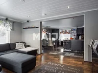 Жилые помещения функционально разделены на два этажа. На нижнем этаже есть уютная гостиная / кухня, вестибюль, прихожая, гардероб, отдельный туалет и стиральные комнаты с сауной. Наверху, помимо вестибюля, есть две спальни, третья комната, которая также подходит в качестве спальни, гардероб и отдельный туалет.
