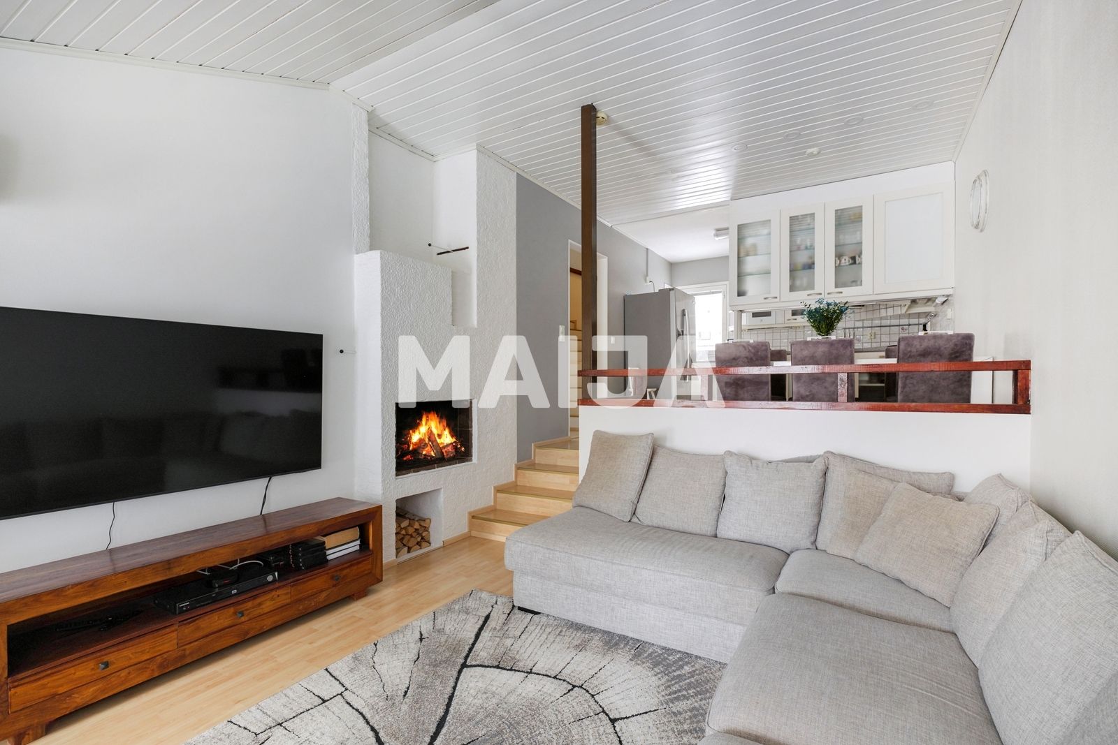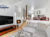 Квартира действительно уютная и имеет просторные площади. У входа есть практичная и яркая стеклянная веранда. Сердцем дома является гостиная-столовая, расположенная внизу, спроектированная на двух разных уровнях, с камином. Из гостиной есть доступ к террасе, покрытой легкой крышей, и к огороженной дворовой зоне, используемой квартирой. В конце лестницы, ведущей наверх, есть просторный вестибюль с доступом к обеим спальням и балкону. В квартире есть два воздушных тепловых насоса и оконная сауна с опалубкой и мгновенной плитой. Кухня с окном хорошо оборудована и функциональна.