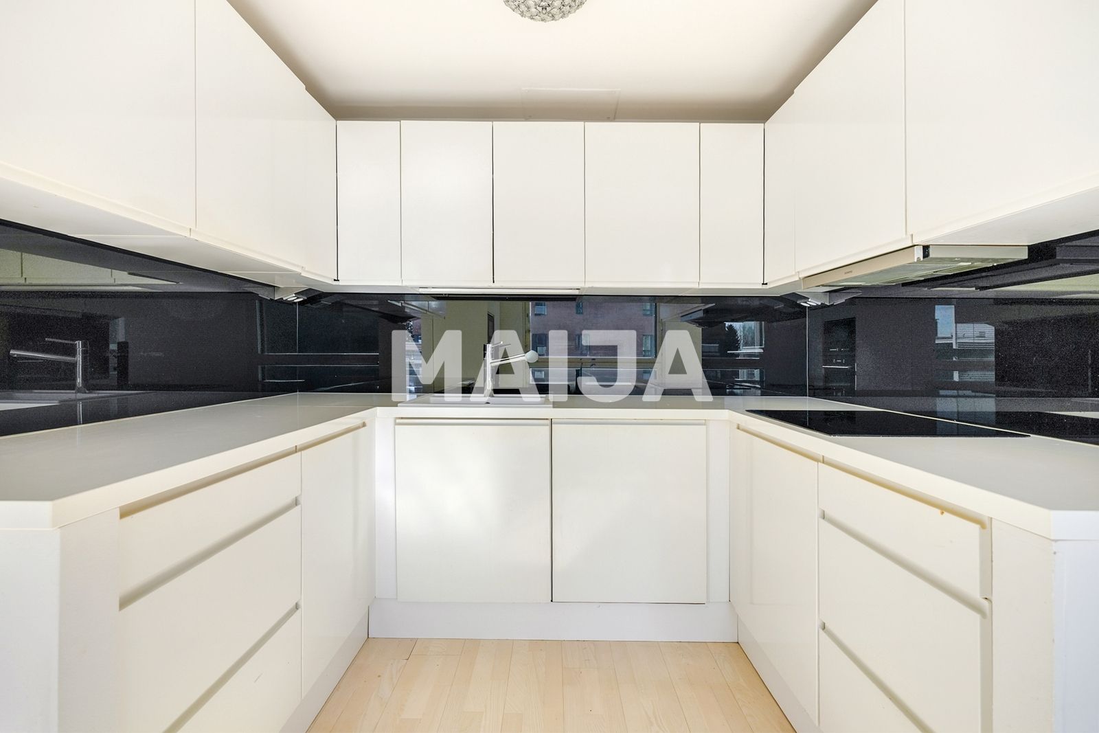 Гостиная расположена в углу дома и имеет окна в двух направлениях и выход на один из балконов. Кухня красивая и светлая по цвету и соединена с гостиной непрерывной обеденной зоной. Две спальни находятся практически по разные стороны квартиры, одна имеет выход на балкон. В квартире также есть сауна с окном и большая ванная комната.