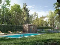В центре комплекса между корпусами сделан ландшафтный сад, а в южной части участка есть общий бассейн. Частные парковочные места в подвале оборудованы зарядными станциями, также есть комната для велосипедов.