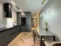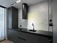 В отделке использованы двери скрытого монтажа, стеклянная перегородка, кварц-винил, уложенный “французской ёлкой”, цилиндрическая вытяжка и скрытая сантехника.
