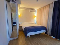 Квартира просторная, светлая и солнечная. В квартире установлены 2 кондиционера и 2 большие кровати — в гостиной и в спальне, что позволяет разместить большую семью, а значит, даёт больше шансов на сдачу её в аренду.