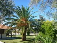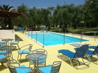 Прекрасный бассейн с баром у бассейна, окружённый оливковыми деревьями и яркими цветами, создаёт идиллическую атмосферу для отдыха.