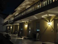 Balustrades with classically shaped columns complete the Mediterranean facade which is magnificently illuminated during the night.