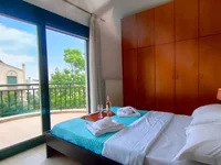 Просторный балкон предлагает панорамный вид на море, а окружающий сад предоставляет идеальное место для отдыха и расслабления.
