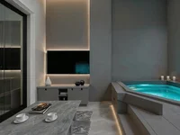 Penthouse P1 at Portside Residence offers a luxurious living experience with a private terrace featuring a jacuzzi, built-in BBQ, and stunning panoramic views over the Port of Piraeus.