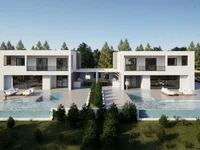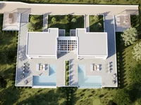 Внешняя территория каждой виллы включает бассейн площадью 65 кв.м., веранды на первом этаже 33 кв.м., веранды на первом этаже 180 кв.м., полуоткрытое пространство 7 кв.м., биоклиматическую перголу с барбекю площадью 25 кв.м., парковочные места для 2 автомобилей (35 кв.м.) и частный участок 3 000 кв.м.