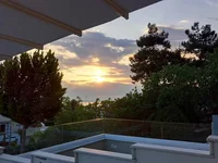 На основном этаже — уютная гостиная и столовая с выходом на террасу, а на верхнем уровне находится главная спальня с отдельной ванной комнатой, гардеробной и великолепным панорамным видом.