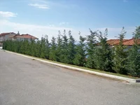 Территория участка 1.300 кв.м с очень большим фасадом (56 м от дороги и 42 м с пешеходной зоны), который граничит с тропинкой и лестницей, которая принадлежит только этому участку, а также граничит с зеленым насаждением.