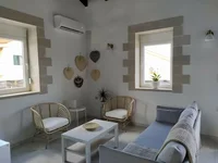 Вход открывается в гостиную, которая затем соединена с современной белой кухней, которая также имеет стеклянную дверь, глядящую на бассейн. В доме есть две спальни - одна с двуспальной кроватью и одна с двумя односпальными кроватями, а также чердак с двуспальной кроватью и очень уютная зона для сидения с подушками. Все спальни имеют выход на улицу, на другую сторону сада каждая. Мебель дома совершенно новая и современная, в основном белая и ротанговая богемная.
