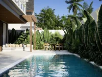 - На открытой территории — собственный бассейн, зоны отдыха, частный сад с декоративными прудами и видом на тропическую зелень.