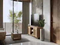 Elegant minimalist design with wood and natural stone finishes