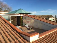 Небольшой садик (примерно 80 м2). В гараж на две машины ведет удобная внутренняя лестница, а от гаража к дому – витая внешняя, парадная и широкая. На первом этаже (200 м2) располагаются: большая кухня, гостиная с выходом на террасу, три спальни, две ванные комнаты, два больших балкона. На втором этаже мансардное помещение-студия с кухней, камином, ванной комнатой и огромной террасой, откуда открываются красочные картины морского горизонта, живописных холмов и горных рельефов.