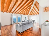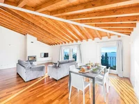 Очень светлая гостиная, оборудованная двумя удобными диванами и современным обеденным столом. Камин делает обстановку уютной и элегантной одновременно. Большие окна в гостиной естественный свет нам уникальную панораму. Отсюда вы можете увидеть Ла Рокка ди Манерба, остров Гарда и веронский берег с красивейшей горой Монте-Бальдо и великолепные пейзажи озера. Угол гостиной посвящен кухне, оборудованной всеми современными удобствами. На небольшой балкон с чудесным видом на озеро можно выйти прямо из кухни.