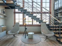 2-й этаж - 85 м2, просторная гостинная, объединенная с обеденной зоной и кухней, камин, терасса с видом во внутренний двор.