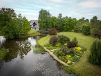 - На территории участка протекает приток реки Maza Jugla, построен мост, через который дополняется ландшафт и открывает доступ на другой берег.