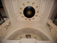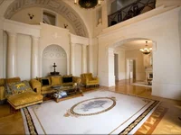 Презентабельной гостиной комнаты с десятиметровым потолком, столовой, трех спальнен на первом этаже - каждая спальня имеет свою личную ванную комнату, главная спальня с гардеробной, просторными встроенными шкафами и будуаром, гостевого санузла, кабинета с камином и кухни. На втором и третьем уровне находятся библиотека, каминный зал, сауна с душевой, бильярдная, а также небольшая отдельная комната с гардеробной.