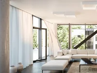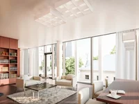 Квартира имеет 3 спальни, 3 сан.узла. Окна спален выходят в тихий зеленый двор. Панорамные окна выходят на городской пейзаж. Две широкие террасы.
