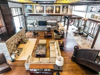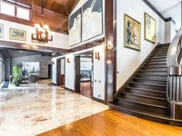 - каминный зал с витражами и видом на реку, главная большая спальня с 2 гардеробами и 2 санузлами, еще 4 спальни с гардеробами и своими ванными комнатами, тренажерный зал, кабинет, кухня и обеденная зона.