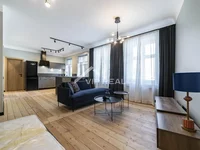 На продажу предлагается современная квартира в реновированном доме в центре Риги.В квартире расположен просторный зал с камином, совмещенный с кухней-столовой, одна изолированная спальня и санузел.Квартира оборудована всей необходимой мебелью и техникой. Квартира оформлена в современном стиле с использованием натуральных, качественных отделочных материалов. Сохранены и отреставрированы деревянные полы и двери.Закрытая территория дома.