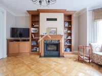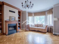 На первом этаже - просторная прихожая с большими встроенными шкафами, гостиная с камином, отдельная кухня и санузел. На втором этаже две изолированные спальни, одна из них со своей гардеробной, санузел, гардеробная и терраса. На третьем этаже просторная комната с санузлом. В цокольном этаже располагается сауна с комнатой отдыха и постирочная-санузел.Ухоженная территория с беседкой, есть гараж.