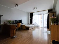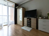 Просторная и светлая студия расположена на 10-м этаже современного жилого комплекса. Панорамные окна открывают впечатляющий вид на город, а вечерами вас будут радовать завораживающие закаты.