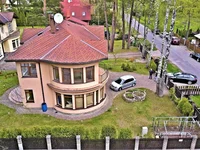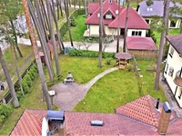 Фасадный дом, благоустроенный двор, окружен деревянным забором.