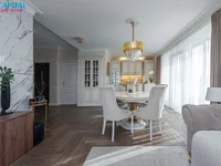 Современная классика интерьера пронизана эстетикой и стильными деталями. В установке использовался материал самого высокого качества: натуральный дубовый паркет, кухонная мебель ручной работы с мелкими золотыми деталями, натуральные гранитные поверхности, индивидуальная мебель. Чувство элегантности создают также хрустальные лампы, декоративные наклейки на стене и потолке, а также элементы лестницы.