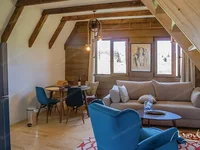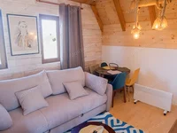 Домики полностью укомплектованы современной мебелью и оснащены необходимой бытовой техникой. Установлены современные печи на пеллетах.