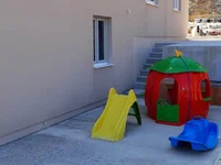 On the ground floor there is a one bedroom apartment consisting of a living room with a dining area and a kitchen, one bedroom and a bathroom. The apartment has a large terrace overlooking the sea.