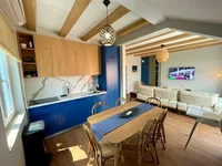 Структура: Гостиная/кухня, 2 спальни, 2 ванные и один гостевой туалет, 3 террасы. Расположение: в коридоре 1 санузел, рядом помещение для стиральной машины и гостевой санузел. В 1-й спальне терраса с видом на двор и лес, во 2-й спальне находится санузел, спальня имеет небольшой балкон с видом на лес и поселок. Гостиная, совмещенная с кухней, имеет большую террасу 15 кв.м с видом на залив, есть дымоотвод для подключения камина. Квартира полностью оборудована мебелью и техникой.