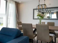 The first level of the villa consists of an open living room with a kitchen and dining room, one bathroom, an entrance hall and a storage room. The kitchen is fully equipped with an electric hob, oven, fridge, microwave, dishwasher, toaster, electric kettle, cutlery, crockery, pots and pans.