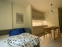 По структуре - студия. Оборудована мебелью и техникой. Без балкона.