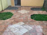 Первый этаж - прихожая, кухня и столовая, а также большая гостиная, откуда есть выход во двор, где находится подсобное помещение с летней кухней и кладовой