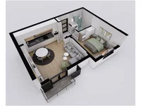Квартира состоит из гостиной с зоной кухни, спальной комнаты, санузла и террасы.