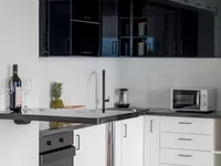 Верхний этаж имеет две роскошные спальни со встроенными шкафами, стеклянными стенами от пола до потолка и частным доступом к балкону с видом на море и закат. Они делят современную ванную комнату с премиальной отделкой.